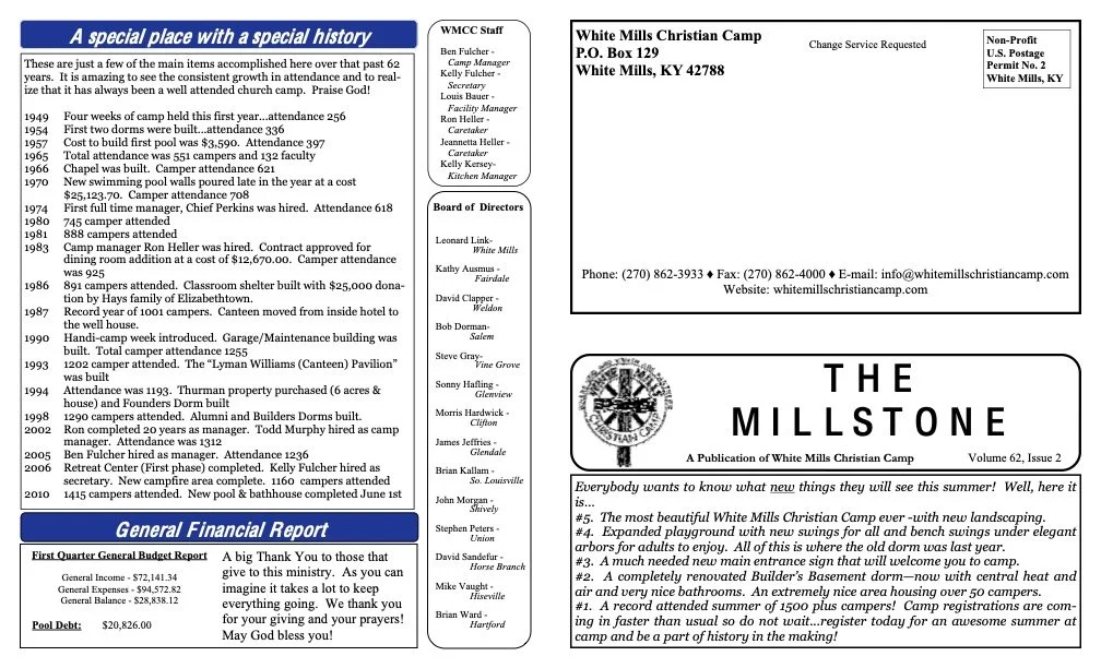The Millstone. White Mills Christian Camp 12/14/22 White Mills Christian Camp 12/14/22 2013 - 2nd Issue Read More White Mills Christian Camp 12/14/22 White Mills Christian Camp 12/14/22 2013 - 1st Issue Read More White Mills Christian Camp 12/14/22 White Mills Christian Camp 12/14/22 2012 - 3rd Issue Read More White Mills Christian Camp 12/14/22 White Mills Christian Camp 12/14/22 2012 - 2nd Issue Read More White Mills Christian Camp 12/14/22 White Mills Christian Camp 12/14/22 2012 - 1st Issue Read More White Mills Christian Camp 12/14/22 White Mills Christian Camp 12/14/22 2011 - 3rd Issue Read More White Mills Christian Camp 12/14/22 White Mills Christian Camp 12/14/22 2011 - 2nd Issue Read More White Mills Christian Camp 12/14/22 White Mills Christian Camp 12/14/22 2011 - 1st Issue Read More White Mills Christian Camp 12/14/22 White Mills Christian Camp 12/14/22 2010 - 4th Issue Read More White Mills Christian Camp 12/14/22 White Mills Christian Camp 12/14/22 2010 - 3rd Issue Read More White Mills Christian Camp 12/14/22 White Mills Christian Camp 12/14/22 2010 - 2nd Issue Read More White Mills Christian Camp 12/14/22 White Mills Christian Camp 12/14/22 2010 - 1st Issue Read More White Mills Christian Camp 12/14/22 White Mills Christian Camp 12/14/22 2009 - 4th Issue Read More White Mills Christian Camp 12/14/22 White Mills Christian Camp 12/14/22 2009 - 3rd Issue Read More White Mills Christian Camp 12/14/22 White Mills Christian Camp 12/14/22 2009 - 2nd Issue Read More White Mills Christian Camp 12/14/22 White Mills Christian Camp 12/14/22 2009 - 1st Issue Read More White Mills Christian Camp 12/14/22 White Mills Christian Camp 12/14/22 2008 - 4th Issue Read More White Mills Christian Camp 12/14/22 White Mills Christian Camp 12/14/22 2008 - 3rd Issue Read More White Mills Christian Camp 12/14/22 White Mills Christian Camp 12/14/22 2008 - 2nd Issue Read More White Mills Christian Camp 12/14/22 White Mills Christian Camp 12/14/22 2008 - 1st Issue Read More Newer Posts